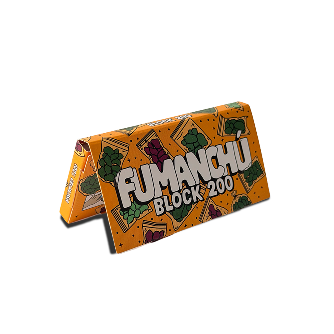 Fumanchu transparent cellulose rolling papers in 1 1/4 size, presented in the Block 200 format—an innovative option that includes 200 sheets per booklet, offering extended use and added value compared to standard packs.